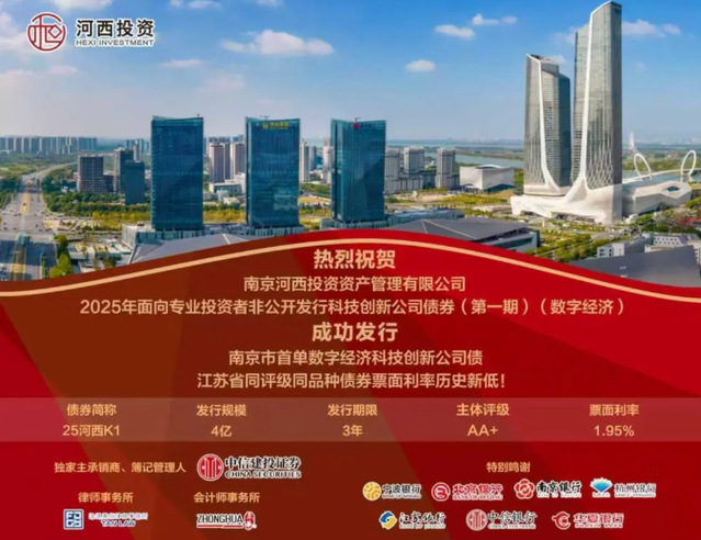 12月15日,河西集團(tuán)南京河西投資資產(chǎn)管理有限公司(以下簡稱“河西投資”)2025年面向?qū)I(yè)投資者非公開發(fā)行科技創(chuàng)新公司債券(第一期)(數(shù)字經(jīng)濟(jì))于上海證券交易所成功發(fā)行,系河西投資在債券市場的首次亮相。本次債券發(fā)行期限為3年,規(guī)模4億元,利率1.95%,為江蘇省同評級同品種債券票面利率歷史新低。